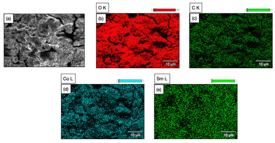 SEM images of the precipitate obtained at pH 6.5 from E1 (a), and EDS maps of O (b), C (c), Sm (d), and Co (e).