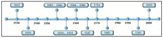 The 5xxx aluminum-magnesium alloys containing magnesium as the primary alloying element are a heat treatable, non-reinforceable aluminum alloy due to the fact that the second phase precipitated during aging has no significant strengthening effect. This alloy has low density, good machinability and weldability [5] and excellent corrosion resistance [6,7]. Magnesium forms the anodic phase Al3Mg2 or Al8Mg5 in intergranular precipitation, which is beneficial for the formation of grain boundary cracks and stress corrosion. The strength of this alloy is higher than aluminum alloys 1xxx and 3xxx and lower than aluminum alloys 2xxx and 7xxx, indicating that this alloy is a medium strength aluminum alloy. The strength of the alloy increases as the Mg content increases [8,9], but the machinability and corrosion resistance decrease. In short, it seems to have excellent performance and is widely used in automotive, aerospace, shipbuilding, food and other fields [10]. In general, aluminum and magnesium alloys can be produced by several processes, including casting and rolling, hot rolling, cold rolling, extrusion, drawing, forging, etc. Figure 1 shows the timeline of Al-Mg alloys.