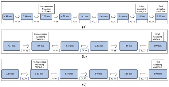The chemical analyses of the samples taken from the sheets, cast at an industrial scale using the Twin Roll Continuous Casting method with an average thickness of 7 mm, were performed using a Thermo Scientific ARL4460 OES spectrometer. The chemical compositions of the sheets comply with the EN 573-3: Aluminium and aluminium alloys–Chemical composition and form of wrought products–Part 3: Chemical composition and form of products and are provided in Table 3.