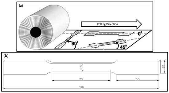 To determine the mechanical properties of AA5182, AA5754, and AA5052 sheets produced by the Twin Roll Continuous Casting method after final annealing, tensile tests were conducted on samples prepared in three different directions (0°, 45° and 90°) according to the dimensions specified in Figure 5a. The geometry of the samples is shown in Figure 5b. Tensile tests were conducted at room temperature using a Zwick/Roell tensile testing machine with test parameters set to a load capacity of 50 kN and a crosshead speed of 10 mm/min. All tests were repeatedly carried out at the temperatures applied during the final annealing steps of all three alloys, and the average results were considered.