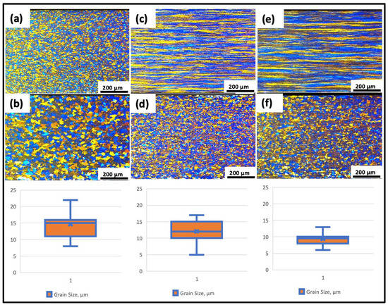 Figure 9 also displays the microstructures of the AA5754 alloy subjected to a thermomechanical route without intermediate annealing: (c) before final annealing and (d) after final annealing. In the microstructure image before final annealing, a banded rolling texture is predominant, and the grains are elongated, while after final annealing, the grains appear finer and show a homogeneous distribution. Similarly, in the microstructure images of the AA5052 alloy: (e) before final annealing and (f) after final annealing, a banded rolling texture is observed to be dominant before final annealing with elongated grains, whereas after final annealing, the grains are fine and exhibit a homogeneous distribution.