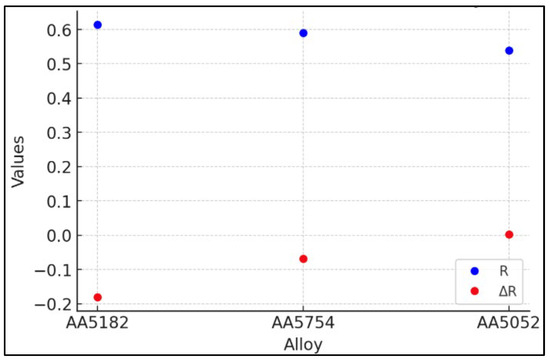 The ΔR value shows a negative value for AA5182 and AA5754, while it presents a positive value for AA5052. This indicates that the AA5182 and AA5754 alloys experience a decline in properties after a specific application or process, whereas the AA5052 undergoes an improvement. The more pronounced decrease in AA5754 compared to AA5182 suggests that microstructural issues, such as centerline segregation, have a more significant impact on this alloy.