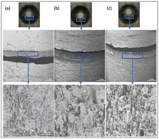 Figure 14 presents images of the rupture surfaces of some samples following the Erichsen test. The morphological structures of the surfaces where rupture occurred have been analyzed in detail. Similar rupture patterns were observed in other samples beyond those examined. These investigations were conducted using a high-resolution ZEISS SmartZoom 5 digital optical microscope, with the rupture morphology further detailed using a SEM. It was determined that the rupture initiated from the lowest point of the bump and progressed in a semi-circular manner. The ruptured surfaces exhibited ductile fracture characteristics due to the samples being subjected to final annealing, and they displayed a porous structure. Additionally, it was concluded that the variation in the ratios of magnesium and other alloying elements, or the influence of intermediate or non-annealed processes, had no significant effect on the rupture behavior of all samples due to their final annealed state.