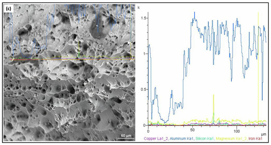 Figure 15 presents a detailed examination of the surfaces of samples that underwent fracture in the 90° direction after tensile testing. The morphological structures of the surfaces where fractures occurred have been analyzed in detail, and it was observed that similar rupture patterns were present in samples beyond those examined. These analyses were conducted using a SEM and EDS. While the fracture morphology was analyzed using SEM, the linear elemental analysis was performed using EDS. The peaks in the Energy Dispersive X-ray Spectroscopy (EDS) results correspond to the characteristic X-ray emission of elements present in the sample. These peaks represent the specific elemental composition at various points of the microstructure. The valleys, on the other hand, occur where no significant X-ray emission is detected, indicating areas where the element concentration is minimal or absent. The scattering observed in the curves is likely due to several factors, such as variations in the local chemical composition, the heterogeneous distribution of phases, and the resolution limits of the EDS analysis. The scattering could also result from the interaction of the electron beam with different phases, causing minor variations in the detected intensities across the sample. The EDS analysis revealed no inclusions other than the main components of the alloy, which are Al, Si, Fe, and Mg. It was determined that the fracture surfaces exhibited ductile fracture characteristics and displayed a porous structure in the final annealed materials. The fact that all samples were in the final annealed state indicated that variations in the ratios of magnesium and other alloying elements, as well as the application of intermediate or non-annealed processes, did not significantly affect the fracture behavior.