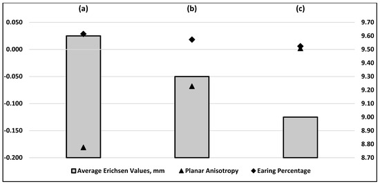 In Figure 16, three different parameters are evaluated: average Erichsen values (mm), planar anisotropy, and ear formation percentage. Each parameter is analyzed as follows: