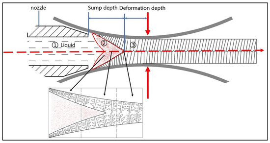 As shown in Figure 17, in the Twin Roll Continuous Casting process, the molten metal (zone 1) in the casting rolling zone is primarily subjected to the effects of the cooling rollers (zone 2) simultaneously, resulting in a significant decrease in temperature. Rapid solidification begins, and the casting process continues (zone 3).