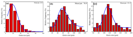 Statistical chart of average grain size distribution at various annealing temperatures (a) 930 °C, (b) 990 °C, and (c) 1050 °C.