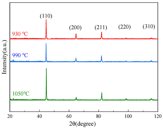 The XRD diffraction patterns of the specimens subjected to annealing temperature are illustrated in Figure 5. After annealing at different temperatures, the primary structure of the steel remained mainly a single ferrite phase. Due to the minimal presence of carbides, they were undetectable in the XRD analysis. The diffraction peak positions of the three types of steel were the same, with only intensity differences. This indicated that the arrangement and number of atoms in the crystal were different. The higher the intensity of the diffraction peak, the greater the degree of crystallization, the larger the grain size, and the corresponding crystal plane grows orderly.