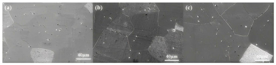 The metallographic structures of the three annealed tested steels are revealed in Figure 3. The matrix of steel was composed of irregular polygonal ferrite grains with a gray-white color. They were fully dense, homogenous, and with clear grain boundaries. Complete recrystallization occurred after annealing. Particles presented a polygonal shape. The grain boundaries exhibited a pronounced bowing towards the neighboring deformation bands in Figure 3a, which suggested that the growth of recrystallized grains occurred through the assimilation of these adjacent deformation zones shown. When the annealing temperature was raised to 990 °C, the already formed equiaxed grains grew rapidly, and fusion occurred between their grain boundaries. The new equiaxed grains continued to grow in Figure 3b, resulting in grains that were too coarse. During annealing, grain growth and recrystallization cause changes in grain size and orientation. The different orientations of grains resulted in different reflections and refractions of light, leading to varying shades of color. Larger crystals exhibited reduced light scattering, resulting in a brighter appearance, whereas smaller crystals demonstrated increased light scattering, leading to a darker appearance. It was indicated that finer and more uniform grains could be obtained during annealing at 930 °C.