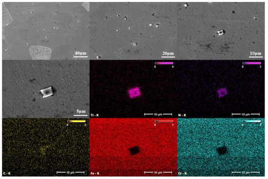 Analyses of the precipitate phase were conducted with SEM and Energy Dispersive Spectrometer (EDS) for 70–930 °C tested steel specimen to further characterize the type and features of the precipitate phase, as shown in Figure 7. It could be determined that the precipitate particles of the rectangular prism were Ti(C,N) with a size of approximately 4 μm. This was due to the strong affinity of Ti for the C and N impurity elements in the matrix, and the carbonitrides of Ti shared the same crystal structure, enabling an unlimited solid solution between them. Consequently, fine Ti(C,N) composite precipitate phases were readily formed within the matrix steel. MC-type particles were randomly distributed in Ti-containing FSS, which had a less detrimental effect on the performance of stainless steel and could also play a role in pinning grain boundaries. Previous studies have shown that these larger Ti(C,N) precipitates were mostly formed during the solidification process of the steel [28].