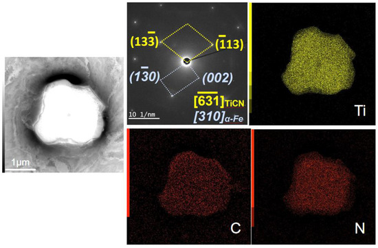The morphology and structure of the precipitate phase for the 70–930 °C tested steel specimen via TEM bright field image are shown in Figure 8. It was observed that Ti, C, and N elements were uniformly distributed in the particles from the EDS energy spectrum analysis. Through single-crystal electron diffraction analysis, the matrix phase band axis [310]α-Fe and the precipitate phase band axis []TiCN were obtained, and the precipitate phase particles were determined as Ti(C, N).
