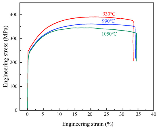 The tensile properties of tested steels were conducted on three stainless steel specimens, and the engineering stress-strain curves were drawn, as illustrated in Figure 9. With the increasing annealing temperature, the tensile strength gradually decreased, while the elongation presented an increased trend. From the stress-strain curves, it could be observed that all three types of steel had strengthening and necking without a distinct yield platform. The stress value with a residual deformation of 0.2% was regarded as its yield strength. The tensile strength, yield strength, and elongation of the three tested steels were 409.1 MPa, 251.4 MPa, 30.9%; 394.3 MPa, 232.1 MPa, 31.4%; 378.6 MPa, 230.2 MPa, and 33.4%, respectively. With the increase in annealing temperature, the grain size gradually increased, the tensile strength decreased, and the elongation slowly increased.