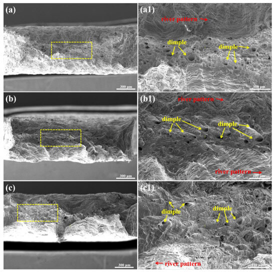 Tensile fracture morphology of the steel at different annealing temperatures (a) 930 °C, (b) 990 °C, and (c) 1050 °C. (a1), (b1), and (c1) are enlarged regions of the yellow boxes in Figures (a), (b), and (c), respectively.