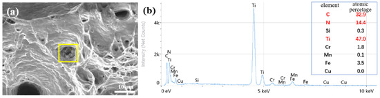 SEM observation disclosed the existence of fragmented inclusion particles at the bottom of the toughness dimples on the tensile fracture surface, as shown in Figure 11a. It was discovered that the main component of the precipitate was Ti(C,N) based on the analysis of SEM and EDS in Figure 11b.