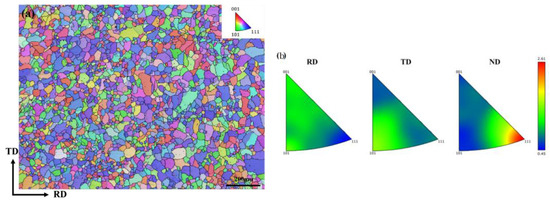Figure 12a shows the OIM map of 70–930 °C the tested steel. Different colors stood for different grain orientations. It could be observed that the number of grains with (111) orientation was evidently abundant. Moreover, the micro grain orientation along the rolling direction still presented a certain banded distribution characteristic. This implied that the grains of 70–930 °C tested steel would exhibit a (111) preferred orientation. The specimen contained grains with a particle size of less than 60.0 μm, accounting for as high as 97.3%, while only an extremely small number of coarse grains existed. Figure 12b was the inverse pole figure. On the inverse pole figure in the rolling direction, the rolling direction indices with relatively high orientation density were <100> and <110>. Among them, the orientation density at <110> reached 1.42, which indicated that the <110> direction of each grain in the steel was parallel to the rolling direction. The orientation density on the inverse pole figure normal to the rolling plane reached up to 2.61 at most. The rolling plane index was {111}, indicating that an obvious {111}<110> planar texture was formed after large-deformation cold rolling. According to the crystal zone law, a kind of fiber texture could be derived as (111).