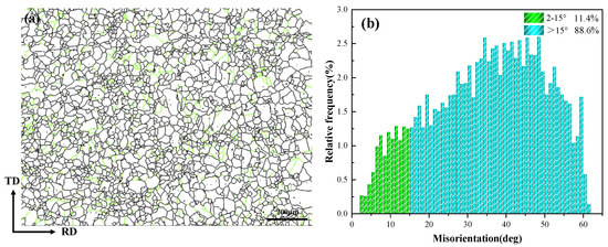 Figure 13 represents the distribution map of grain boundary states and the statistical chart of grain boundary orientation differences of the steel, respectively. In Figure 13a, the thin green lines revealed the small angle grain boundaries with the orientation difference of grains on both sides ranging from 2° to 15°, and the thick black lines represented the large angle grain boundaries with the orientation difference of grains on both sides greater than 15°. It was observed that the black large-angle grain boundaries occupied the majority of the figure. According to the statistical results in Figure 13b, the microstructure of cold-rolled annealed steel showed that small angle grain boundaries accounted for 11.4%, and large angle grain boundaries greater than 15° accounted for 88.6%. There were no sub-angle grain boundaries less than 2°. The orientation difference between adjacent grains increased and became a small angle grain boundary (2–15°) after static recovery. The driving force for recrystallization was the unreleased deformation storage energy after recovery, and its nucleation mechanisms included grain boundary arching mechanism, subgrain migration mechanism, and subgrain merging mechanism. The orientation difference between adjacent grains further increased and became large angle grain boundaries after recrystallization. Most of the grains in the microstructure had completed static recovery and recrystallization, with only a small number of grains in the recovery stage, and there were basically no deformed grains that had not undergone static recovery and recrystallization.