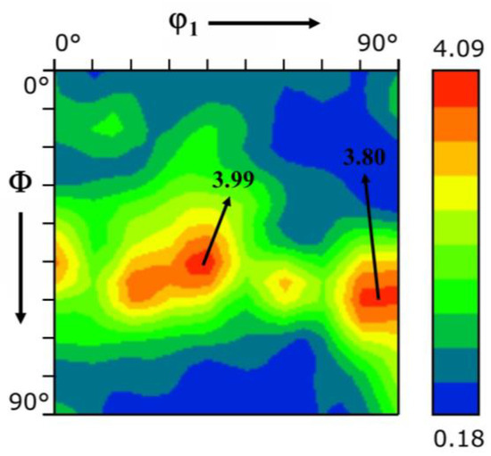 Figure 14 shows the ODF section (φ2 = 45°) of 70–930 °C tested steel. The steel obtained a relatively complete fiber texture after cold rolling and annealing, with the strong points of the texture mainly concentrated near {334} and {554}<22>. The texture orientation density of {334} was f(g) = 3.99, the texture orientation density of {554}<22> was f(g) = 3.80. At the same time, there were still weak fiber textures remaining in the tissue. The strong {554}<22> texture and a certain amount of {112}<110> texture would induce good formability. Previous research has demonstrated that the formation of the {554}<22> texture primarily stems from “Zener” drag and selective growth. In the course of cold rolling and annealing procedures, these factors collaborate with each other, facilitating the emergence of this particular texture. Specifically, “Zener” drag was capable of impeding the migration of grain boundaries, which consequently exerted an impact on the growth and orientation of grains. Meanwhile, selective growth endows grains with specific orientations to take the upper hand in the competitive growth process. It was precisely under such a mechanism that the {554}<22> texture was likely to be formed, and its distinctive orientation structure furnishes advantageous conditions for formability.