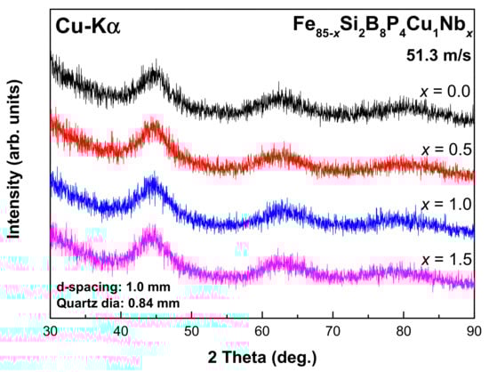 In this paper, we investigated Fe85-xSi2B8P4Cu1Nbx (x = 0.0, 0.5, 1.0, and 1.5) alloys to investigate further effects of Nb addition. Figure 1 shows the X-ray diffraction pattern of Fe85-xSi2B8P4Cu1Nbx (x = 0.0, 0.5, 1.0, and 1.5), an amorphous ribbon scanned through melt spinning. It can be seen that the patterns are all amorphous alloys with wide peaks. This characteristic broadening confirms that the alloys lack long-range crystalline order, indicating an amorphous structure. This observation aligns with typical XRD patterns of amorphous metals, as described in the literature []. Based on previous experimental research experience, the conditions in the manufacturing process of amorphous ribbons were fine-tuned. The results obtained RSP optimization conditions so that the distance between the wheel and the quartz tube was 1.0 mm and the size of the quartz tube hole was 0.84 mm.