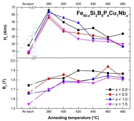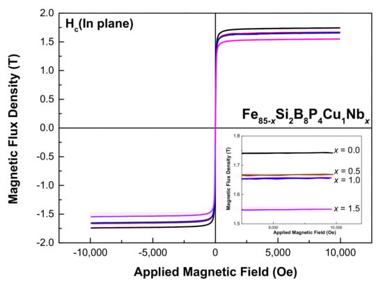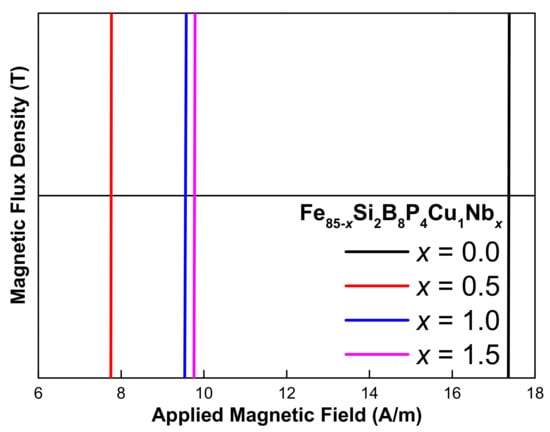 Fe85-xSi2B8P4Cu1Nbx (x = 0.0, 0.5, 1.0, and 1.5) magnetic properties of nanocrystalline ribbons.