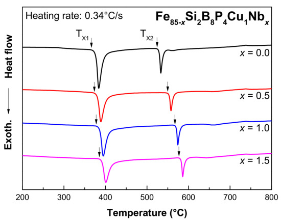 Fe85-xSi2B8P4Cu1Nbx (x = 0.0, 0.5, 1.0, and 1.5) thermal and magnetic properties of amorphous ribbons.