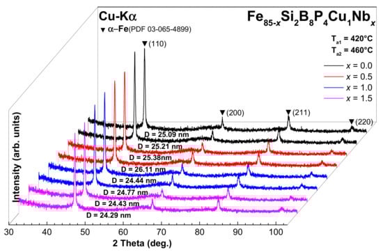 XRD experiments on ribbons heat-treated between 380 °C and 480 °C consistently show the formation of the α-Fe phase. The temperatures of 420 °C and 460 °C were chosen for comparison based on their high saturated magnetic flux density values, as determined by nanocrystal magnetic property analysis. The grain size (D) calculated using the Scherrer formula in Figure 5 shows that D decreases from 25.09 nm to at least 24.29 nm as the Nb addition increases. Scherrer equation-based calculations provide an indirect but valuable tool for assessing nanocrystalline structures. This result suggests that Nb, due to its role in suppressing the crystallization kinetics, contributes to the formation of nanometer-sized magnetic α-Fe phases with smaller grain sizes, as supported by broadening analysis of the XRD patterns [,]. Notably, at 420 °C, Fe85.0Si2B8P4Cu1 (x = 0.0) exhibits optimal magnetism, while all compositions, including Nb, reach their highest saturated magnetic flux density value at 460 °C.