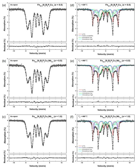 Mössbauer spectroscopy can be used to analyze variations in the magnetic hyperfine field (B-value) at the 57Fe nucleus in Fe-Si-B-P-Cu-Nb alloys, which are determined by the magnetic and electronic configurations in the local microenvironment. This allows for the investigation of how these configurations, arising from the arrangement of magnetic and nonmagnetic atoms, influence local magnetic interactions in both amorphous and nanocrystalline structures. Amorphous materials lack long-range atomic order, whereas nanocrystalline materials consist of nanosized grains that exhibit long-range atomic order within individual grains. In polycrystalline materials, the different random orientations of these grains may result in an irregular overall arrangement. Amorphous and nanocrystalline materials have irregular atomic arrangements or nanosized grains. The amorphous structure can be inferred from the Mössbauer spectra exhibiting broadened absorption lines without well-defined sextet splitting, indicative of the absence of long-range magnetic ordering [,,]. The magnetic and crystallographic structural changes before and after Nb substitution can be compared to investigate the effect of Nb substitution on the alloy structure. Mössbauer spectroscopy provides critical insights into the local magnetic and electronic environments of Fe atoms and can complement other techniques, such as XRD, for investigating the structural characteristics of materials containing both amorphous and nanocrystalline phases []. The annealing of Nb-substituted ribbon samples reveals the formation of nanocrystalline and residual amorphous phases. Furthermore, it is important to use other analytical techniques, such as XRD, in conjunction with Mössbauer spectroscopy to accurately identify the mixed structure of crystalline grains and amorphous phases.