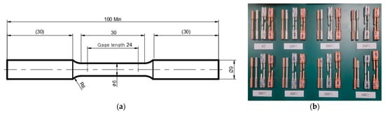 After annealing, the cold-drawn Al and Cu bars and the 20% cross-sectional reduced CCAW manufactured by the multistage drawing process were subjected to a tensile test according to ASTM E8 [24]. The CCAW was subjected to a tensile test using a Φ 2.9 mm wire material using a tensile tester. The specimens before and after the tensile test of Al and Cu bars and the photograph of the tensile test with CCAW are shown in Figure 2.