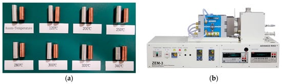 Electrical conductivity, which is an electrical characteristic, was measured by processing Al and Cu materials into Φ 8 mm round bars, polishing the cross-section, and using a thermoelectric evaluation system (ZEM-3M8). The electrical conductivity of CCAW was obtained by taking the reciprocal of the resistivity of 1 m long CCAW measured with a resistance meter. The specimens and equipment for measuring the electrical conductivity and the electrical resistance measurement method of CCAW are shown in Figure 3.