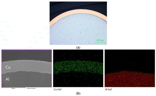 Al/Cu bimetallic composites have relatively superior mechanical properties, electrical properties, and corrosion resistance compared to single materials such as aluminum and copper, and are widely used in the automotive industry, electronic devices, aerospace industry, and shipbuilding components. Excellent mechanical and physical properties are acquired by combining various alloys such as St, Ti, Mg, Ag, Zn, St, and Ni with Al, resulting in the composites being applied to various industries [1,2,3,4,5,6,7]. However, copper-clad aluminum wire (CCAW) has the widest range of applications due to its high electrical conductivity and mechanical properties compared to other materials [8,9].