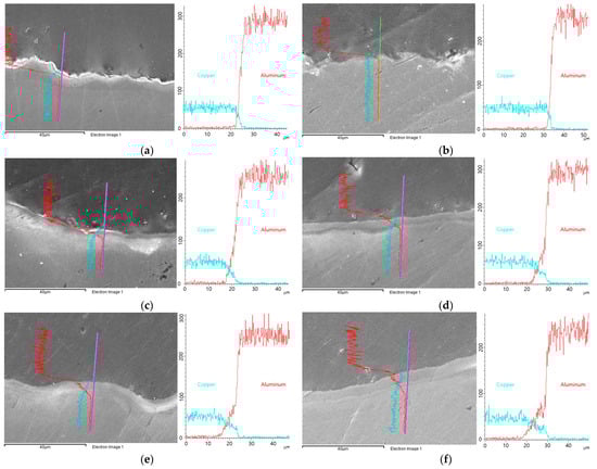 Point EDS measurement was performed with the Al/Cu diffusion layers in the BSE images shown in Figure 8 to analyze the composition of the intermetallic compounds. The representative intermetallic compounds of the Al/Cu alloy were Al2Cu, AlCu, and Al4Cu9, and the Al/Cu mass ratios obtained from the EDS measurement results at each composition were 45.9%:54.1%, 29.8%:70.2%, and 15.9%:84.1%, respectively [11].
