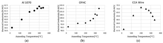 Changes in the electrical conductivity of Al, Cu, and CCAW according to the annealing temperature. (a) Al 1070, (b) OFHC, and (c) 20% CCAW.