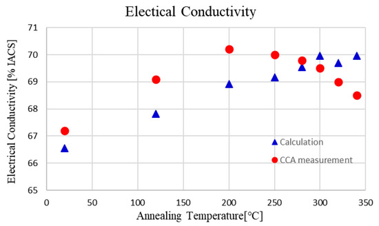 The conductivity values of the Al and Cu materials calculated by using Equation (1) with the heating temperatures shown Table 4 are schematically compared with the measurements values of CCAW, as shown in Figure 11. The calculated values based on the electrical conductivity measurements of Al and Cu and the measured conductivity values of CCAW increased at a similar rate up to an annealing temperature of 200 °C. However, while the calculated values continuously increased above 250 °C, the measured results of CCAW decrease slowly, reaching 68.5%IACS at 340 °C, which is a decrease of 2.4% compared to 70.2%IACS at 200 °C with a decrement of 1.7%IACS. The temperature at which the electrical conductivity was optimized as described by Lapovok et al. [15].