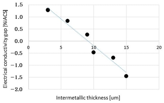 The relationship between the CCAW electrical conductivity gap between the measured values and the calculated values with the intermetallic thickness.