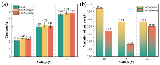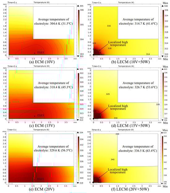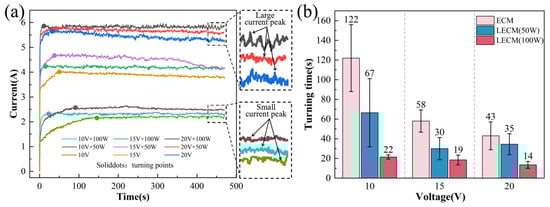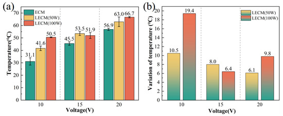 - Laser irradiation promotes an increase in the temperature of the electrolyte, thereby enhancing the electrochemical dissolution reaction. This effect is most significant at the lowest voltage 10 V, where the MRR in LECM shows a 28.6% increase compared to ECM. Furthermore, the laser-induced temperature rise facilitates the breakdown of the passivation layer which is formed due to the Cl− ions, thus increasing MRR. LECM reduces the “breakdown time” of the passivation layer by up to 82% compared to ECM.