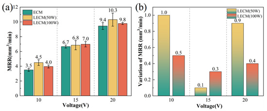 - Voltage is the primary factor affecting the material removal rate (MRR) in LECM, with a material removal rate of approximately 10.3 mm3/min achieved at high voltage (20 V). The recast layer due to laser ablation contains high-fraction oxides. As laser power increases, the fraction of oxide in the recast layer also rises, which hinders the electrochemical dissolution process.