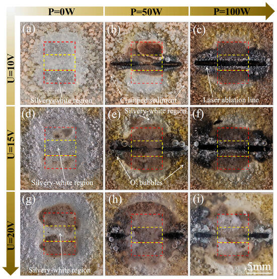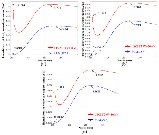 - Hydrogen bubble flow promotes heat convention on the workpiece surface, and effectively removes the precipitates, reducing resistance to electrochemical dissolution. This effect is more pronounced at higher voltages, whereas it is weak at a higher laser power due to the rupture of laser-induced bubbles. According to the simulation results, the current density at the slot is notably lower than at the cathode, which proves that more intensive bubble flow due to the increased voltage can enhance the material removal efficiency at the slot. The recast layers hinder the progress of electrochemical dissolution, while it stimulates the formation of oxygen, further limiting the machining efficiency.