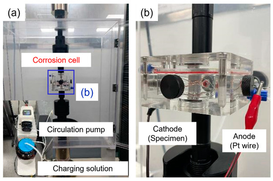 (a) Electrochemical in situ hydrogen charging setup and (b) corrosion cell containing a copper wire connected as the cathode and a platinum wire immersed in the solution as the anode.