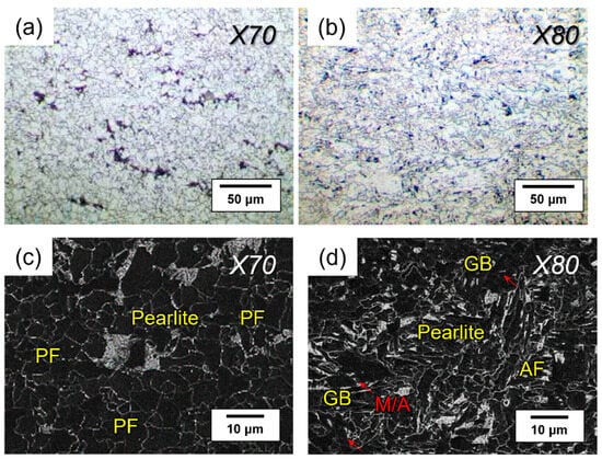 Figure 2 shows optical and scanning electron micrographs of the two API linepipe steels investigated in this study. The X70 steel primarily consisted of PF and pearlite, while the X80 steel exhibited a bainitic microstructure dominated by AF and GB. In the X70 steel, PF was primarily formed along the grain boundaries of the recrystallized austenite during hot rolling, and some pearlite was formed during air cooling. In the X80 steel, the addition of Mo reduced the fraction of recrystallized austenite while increasing the fraction of elongated austenite along the rolling direction during the rolling process, due to the higher recrystallization temperature [19]. Slip bands within the elongated austenite served as nucleation sites for bainitic microstructure during accelerated cooling, promoting the formation of a finer and more irregular-shaped bainitic microstructure [20]. As a result, the X70 steel primarily showed a more polygonal morphology in PF and pearlite, while the X80 steel exhibited a finer and more irregular bainitic microstructure (Figure 2a,b). In addition, the disparities of microstructures were also influenced by processing conditions. The higher coiling temperature of the X70 steel allowed more time for carbon diffusion, resulting in the formation of coarser pearlite, compared to the X80 steel (Figure 2c,d).