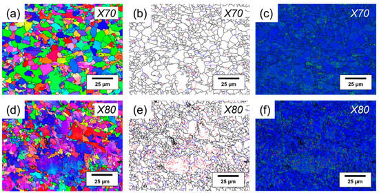 Electron back-scattered diffraction (EBSD) analysis results of (a,d) inverse pole figure maps, (b,e) grain boundary misorientation maps, and (c,f) kernel average misorientation maps of the L-T plane for (a–c) the X70 steel and (d–f) the X80 steel. The angle ranges of the red, blue, and black lines are 2° to 5°, 5° to 15°, and 15° to 180°, respectively.