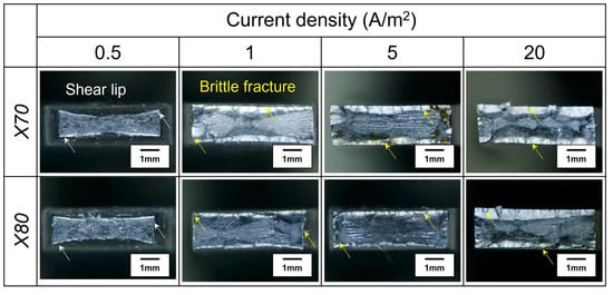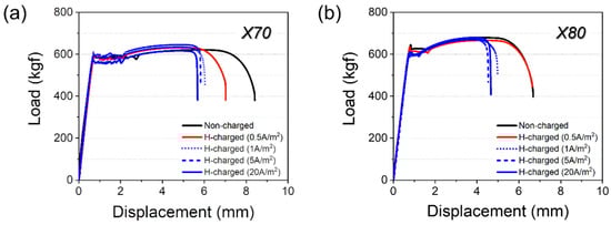 The load–displacement curves of both steels obtained from in situ hydrogen-charged SSRT at various current densities are provided in Figure 4. For both steels, increasing the current density did not affect the strength but resulted in a decrease in displacement at fracture. In all testing conditions, the ultimate tensile strength (UTS) showed variations within approximately 5%, which was considered negligible (Table 2). At a current density of 0.5 A/m2, the X70 steel exhibited a slight reduction in fracture displacement, as its coarse pearlite is more susceptible to hydrogen, weakening its resistance to hydrogen embrittlement [21,22]. At the current densities above 1 A/m2, the displacement no longer decreased, and the specimens fractured suddenly after reaching the tensile strength. Under the hydrogen charging condition of 1 A/m2, where saturation was assumed, the displacement decreased by 29% for the X70 steel and 26% for the X80 steel. Above the charging current density of 1 A/m2, the reduction in displacement was limited to around 6%. It has been reported that the hydrogen content at the surface increases and then saturates at a certain current density as the current density increases [23]. In both the X70 and X80 steels studied, the hydrogen content reached saturation at a current density of 1 A/m2. Consequently, no further reduction in ductility was observed at current densities higher than 1 A/m2 with either steel, showing similar displacement and fracture behavior.