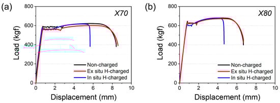 Figure 6 exhibits the load–displacement curves obtained from ex situ and in situ hydrogen-charged SSRT under hydrogen charging current density of 20 A/m2 for both steels. During ex situ hydrogen-charged SSRT, hydrogen can easily diffuse into the air, showing minimal effect on the specimen due to the large lattice sites and rapid diffusion in the BCC crystal structure of bainitic and ferritic microstructures [24]. As a result, the load–displacement curve of ex situ hydrogen-charged SSRT showed no significant difference in tensile properties, while the in situ hydrogen-charged SSRT results showed a loss of displacement, compared to the non-charged specimen.