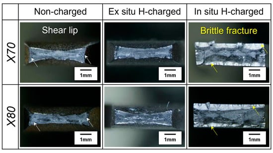 Stereographic microscope images of fracture surfaces for ex situ and in situ slow strain rate test (SSRT) specimens under a current density of 20 A/m2 for the X70 and X80 steel. The white arrows indicate regions where shear lips are observed, while the yellow arrows point to areas exhibiting brittle fracture.