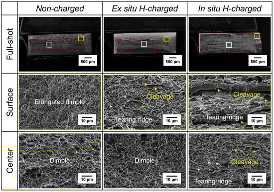 In the present study, continuous hydrogen charging changed the fracture behavior, causing brittle fracture across the entire fracture surface without necking (Figure 5 and Figure 7). A careful analysis of the fracture surface is necessary to determine the underlying causes of the fracture behavior. Fracture surfaces are typically classified as either brittle or ductile, but quasi-cleavage fractures are challenging to categorize as they exhibit characteristics of both [26]. Quasi-cleavage fracture, a type of brittle fracture within grains, is characterized by fractures along cleavage planes and tearing ridges formed along slip systems due to localized plastic deformation [27]. Quasi-cleavage may feature areas where dimples are partially developed or coexist with cleavage fracture, and this characteristic arises from differences in local microstructural factors [28].