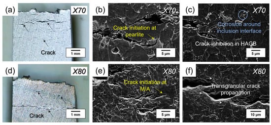 Stereoscopic microscope image and scanning electron microscope (SEM) image of the side surface of the in situ slow strain rate test (SSRT) specimens, highlighting major crack initiation sites and propagation paths for (a–c) the X70 steel and (d–f) X80 steel.