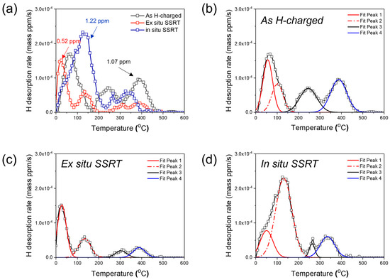 (a) Comparison of thermal desorption analysis (TDA) results of the tensile specimens of the X70 steel charged for 24 h at the electrochemical hydrogen charging current density of 20 A/m2, after ex situ hydrogen-charged SSRT and in situ hydrogen-charged SSRT with the non-pre-charged condition. The separated peaks of (b) As H-charged, (c) ex situ SSRT, and (d) in situ SSRT specimens using the Gaussian method.