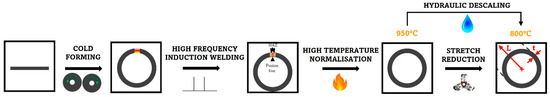 Mild steel is delivered as a coil formed from a continuous cast billet. The steel sheet then passes through an accumulator series and is cold worked by forming rolls into the required hollow, cylindrical geometry. At this stage, the sheet still has a fine, homogenous microstructure, ensuring technical standard-defined mechanical properties. High frequency induction (HFI) welding is used to join the formed ends of the steel sheet creating a heat affected zone (HAZ) and some residual stresses. Therefore, the tube is subsequently heated to a temperature of over 950 °C for 2–4 min in a walking beam furnace, which restores the bulk to the desirable austenitic phase, before cooling in air. Tubes produced in this manner have several advantages over their cold-forged equivalents, including improved toughness, ductility, and pressure integrity, giving them an overall higher factor of safety. However, rapid growth of a multi-phase layer of dark-coloured, brittle iron oxide scale is also observed. Further thermomechanical processing (TMP) is used to produce a range of tube wall thicknesses and tube diameters, achieved by a multi-pass stretch reduction of 3–5% reduction per stand, with the greatest reduction occurring in the first few stands). The processing temperature is defined by achieving a balance between strain hardening and softening to minimise deformation-induced point and line defects (which are also defined by chemical composition, initial microstructure and deformation condition, deformation rate), and maintaining the material in the austenitic region. Typically, hydraulic descaling is applied in a post-normalisation, pre-reduction ‘descaling box’ for its combined benefits of reduced scale compaction and partial cooling to the ideal stretch reduction temperature of 850 °C. A summary of the manufacturing process is shown in Figure 1.
