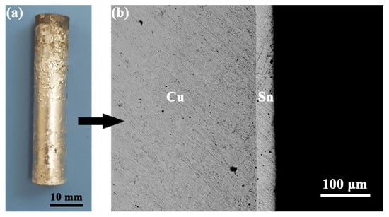 AZ91D ingots, a 10 mm Cu bar, and a 20 × 20 × 0.8 mm3 Cu plate were used in this study. Table 1 lists the chemical composition of the AZ91D ingots, measured via inductively coupled plasma–optical emission spectroscopy (ICP-OES, AGILENT 730, Agilent Technologies Inc., California, CA, USA). During the HDTC process, Cu was dipped in a pure Sn melt at 500 °C for 2 s. The surface of the Cu was first sanded with metallographic abrasive paper (grade 400–1000) and then rinsed with absolute ethyl alcohol. The sample and a SEM micrograph of a cross-section of the HDTC-treated Cu are shown in Figure 1. The thickness of the Sn coating on the Cu surface was about 36 μm.