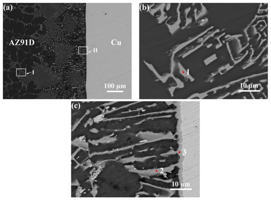BSE micrographs of the interface of (a) AZ91D/Cu, (b), and (c) magnification of regions I, II marked in (a), respectively.