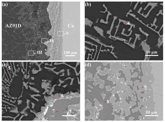 A large number of labyrinthine IMCs formed at the interface. Figure 6b shows the microstructure of region III in Figure 6a. The intermetallic compound in this area was a square maze, similar to the observation shown in Figure 5. Figure 6c shows that the leftmost part of the transition layer formed a sub-layer structure. A large number of continuous bulk-like IMCs were present in the reaction layer, as shown in Figure 6d. The results of the corresponding EDS analysis are also shown in Table 2. Based on the atomic ratios and the literature [18,19], the types of IMCs formed at the interface were determined. The labyrinthine IMC at point 4 was Mg(Al, Cu)2, and the needle-like IMC at point 5 was Mg2(Al, Cu). The result for point 6 shows that the transition layer comprised a Mg(Al, Cu)2 phase near the AZ91D matrix. The results for points 7 and 8 show that a Mg2Cu phase was the matrix in the transition layer. The point 9 results show that the bulk phase in the transition layer was MgCu2.