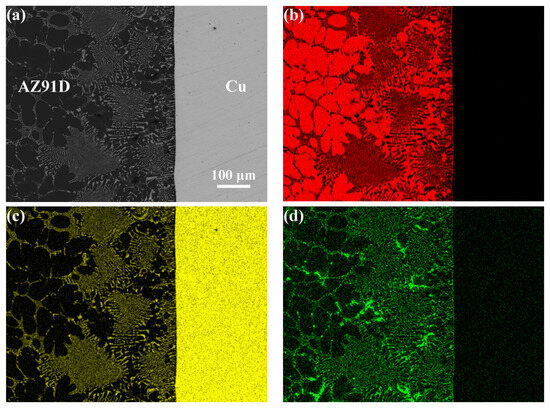 (a) BSE micrographs of the interface of AZ91D/Cu, (b) Mg mapping, (c) Cu mapping, (d) Al mapping.